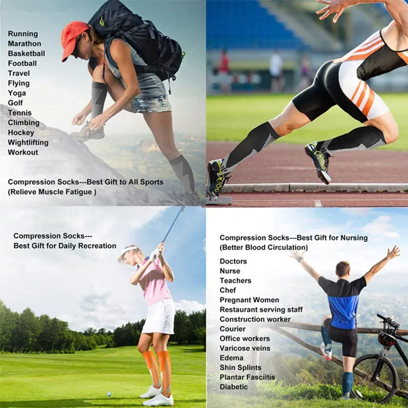Whether you're an athlete who wants to excel in the game, who sit for long period during travel or at work, or someone dealing with pain due to a chronic condition, supporting proper blood flow to your feet is of the utmost importance.Our Compression Socks are engineered with the latest arch to calf compression technology, offering a targeted foot to calf muscle support,help to keep blood flowing to boost athletic performance and alleviate pain due to a number of conditions.